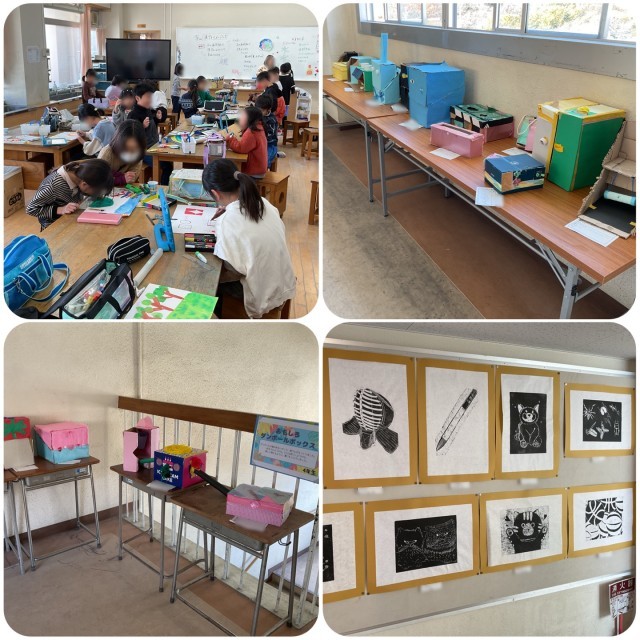 12月に入ってから、廊下には、子どもたちの作品が少しずつ増えてきています。3階の階段を上がったところでは、「おもしろ段ボールボックス」の作品が展示されていました。また、6年生の教室近くには、版画の作品が展示されています。個人懇談等で本校に来られた時には是非ご覧ください。 -