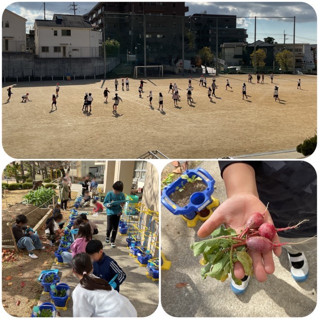 今日4時間目の様子です。3年生図工の時間では、漢字をイメージした作品作りに励んでいました。2年生生活の授業では、育てているラディッシュやホウレンソウ、小松菜などの観察をしていました。可愛らしいラディッシュができていました!4年生は学年体育。4つのコートに分かれてアルティメットの試合をしていました。