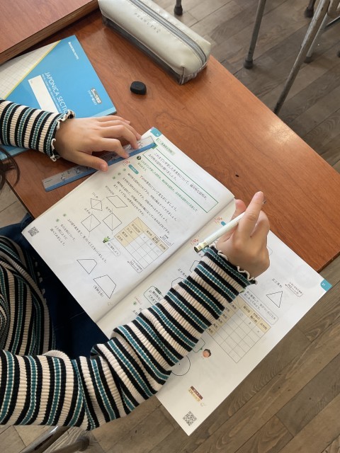 6年2組は、算数科の授業で、点対称な図形を一生懸命に作図していました。