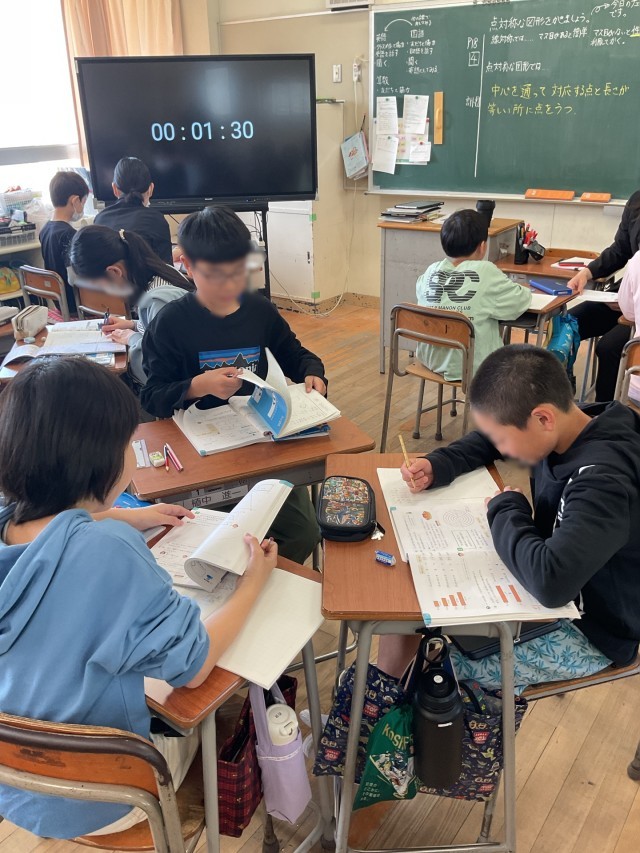 6年生は、算数の線対称の学習で、個別に練習問題に取り組んだり、グループ学習したりする姿が見られました。