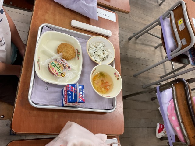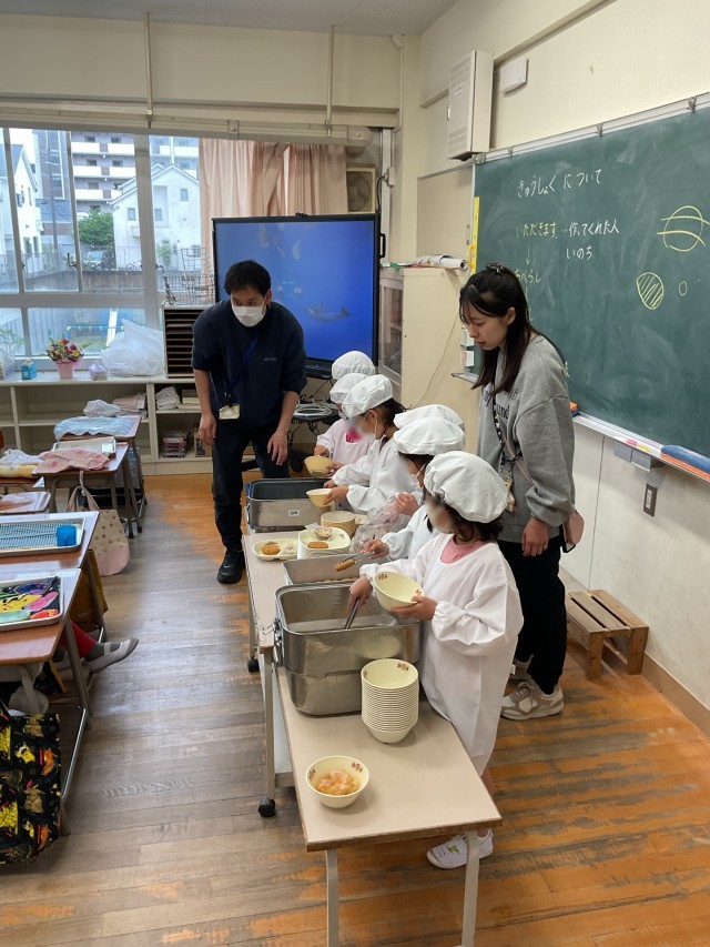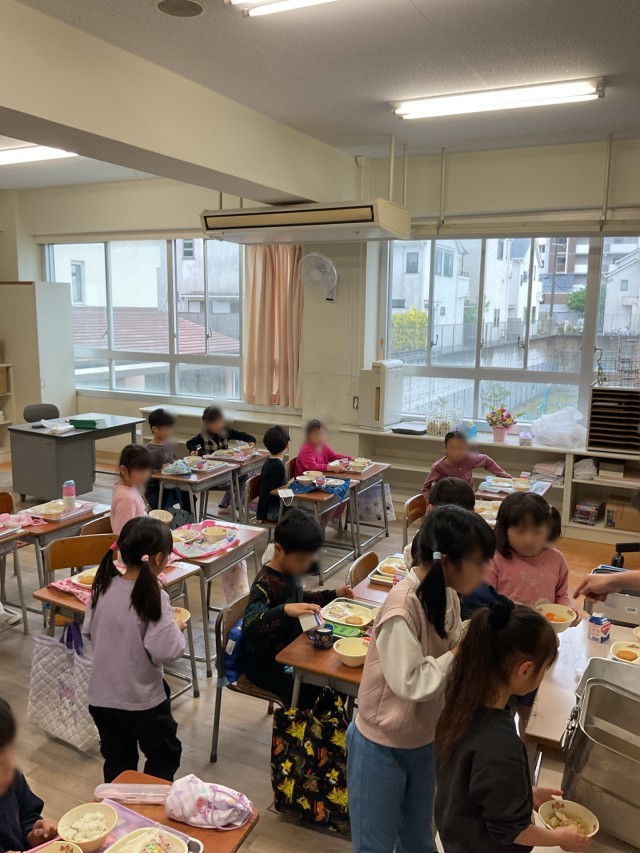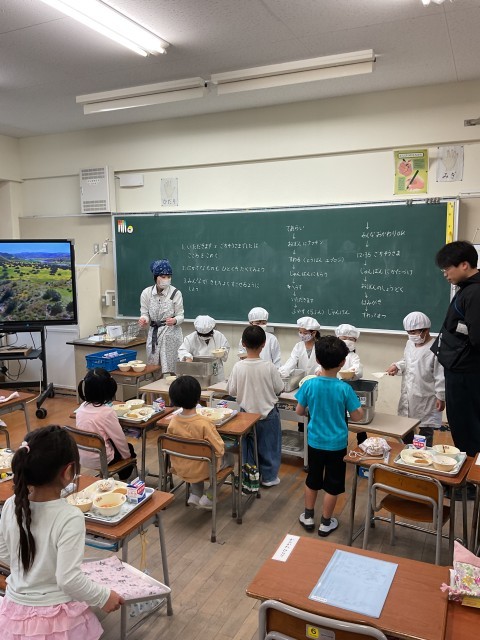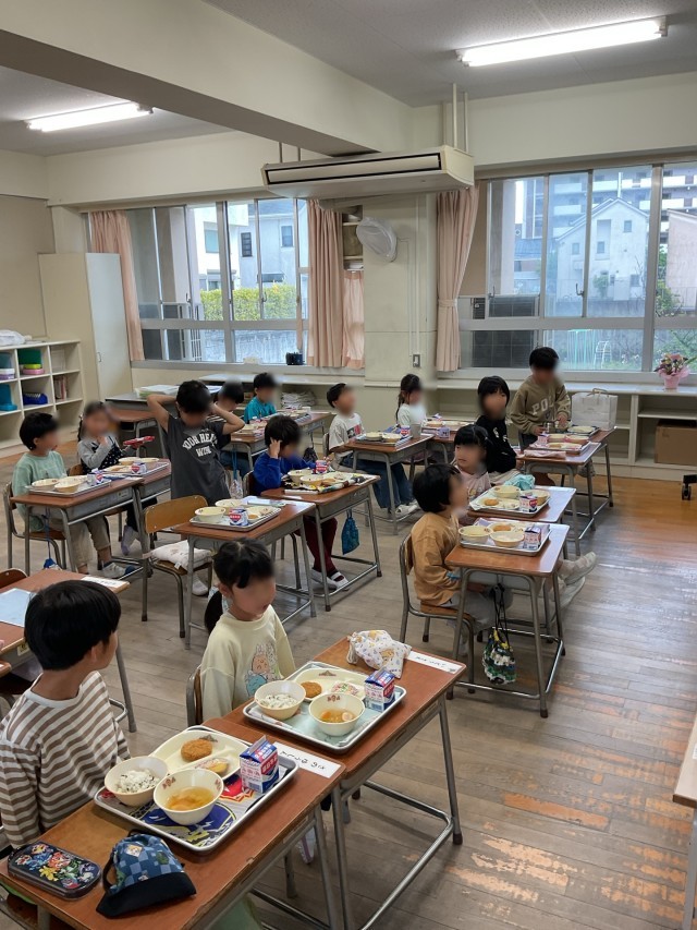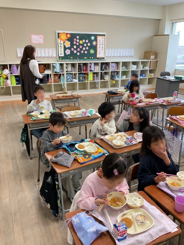 1年生は、今日から給食開始。準備や片付け、増やしたり減らしたりのルールを確認して
