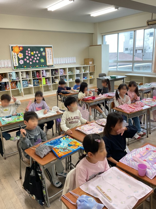 1年生は、聴力検査を行った後、ひらがな「い・ち」をドリルノートに丁寧に練習したり、絵本の読み聞かせをしました。