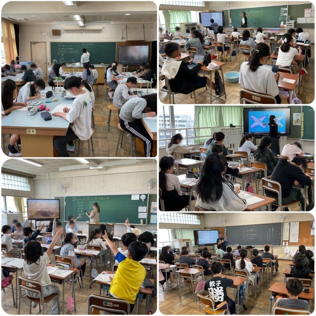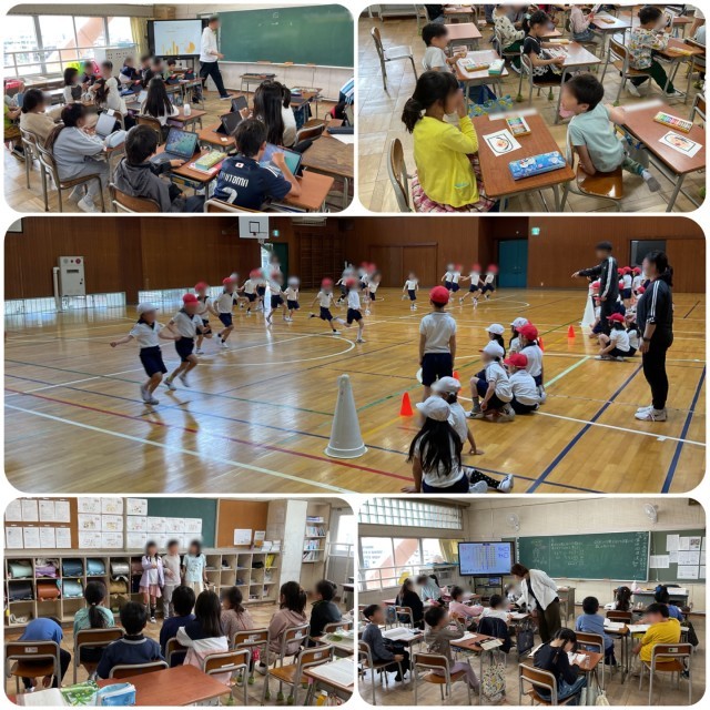 2時間目のクラスでの様子です。1年生は図工の時間で、自分の顔をクレヨンで描いていました。2年生は学年体育。ペアで手を繋いで競争していました。3年生は国語と算数の学習。国語では詩の暗唱(発表)をしていました。4年生は社会と国語の学習。社会科では、都道府県について学習していました。5年生は、2クラスともタブレットの設定を行っていました。6年生は算数と理科の学習。理科では「ものが燃えるしくみ」についての学習を行っていました。