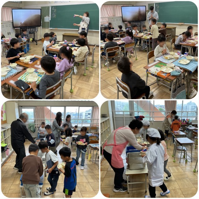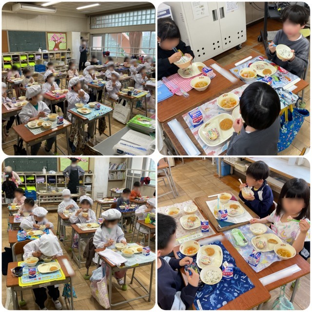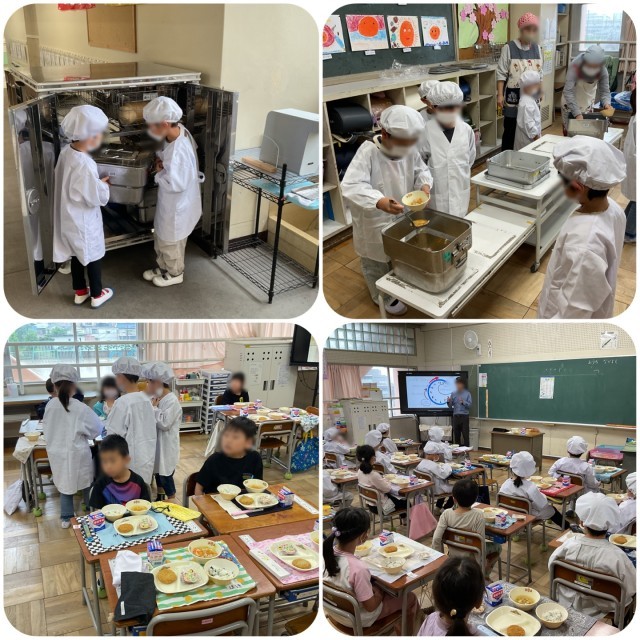1年生は、今日から給食がはじまりました。初めての給食に子どもたちはワクワク。給食の流れや配膳のしかたなど、担任の先生が1つずつていねいに説明し、応援の先生も一緒に入って準備をしました。「いただきます」の掛け声で給食開始。美味しいと笑顔で食べている子が多かったです。最後の後片付けまで自分たちで行い、給食は終了。ごちそうさまでした!