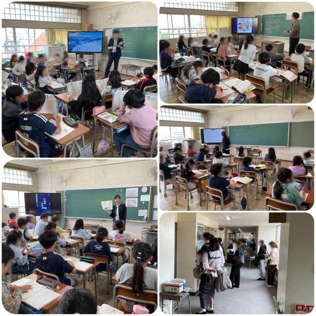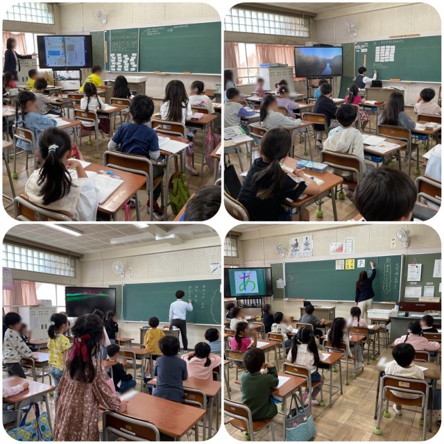 1年生は、国語の授業。ひらがな「あ」のつく名前を答えたり粘土で「あ」を作ったりして楽しく学習していました。2年生は算数の授業で、数の大きい小さいをわかりやすく表す学習に取り組んでいました。3年生は道徳の授業。「貝がら」「鬼太郎をかいたゲゲさん」と、それぞれの教材を用いて学習を行っていました。4年生は国語と道徳、5年生は社会、6年生は国語と社会・・・どの教室も、子どもたちは集中して学習に取り組んでいました。