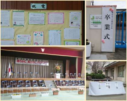 式の後、運動場で記念撮影をし、教室で最後の授業。12時過ぎには花道を通って旅立っていきました。体調不良で3名の欠席があり残念でしたが、別の日に、校長室で卒業式を行う予定です。