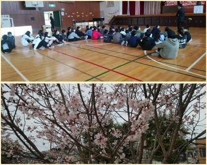 曇り空の朝でしたが、式が終わり、記念撮影の時には太陽が出て眩しくなりました。校舎と運動場の間の桜の木は、開花がすすみ、卒業を祝ってくれていました。
