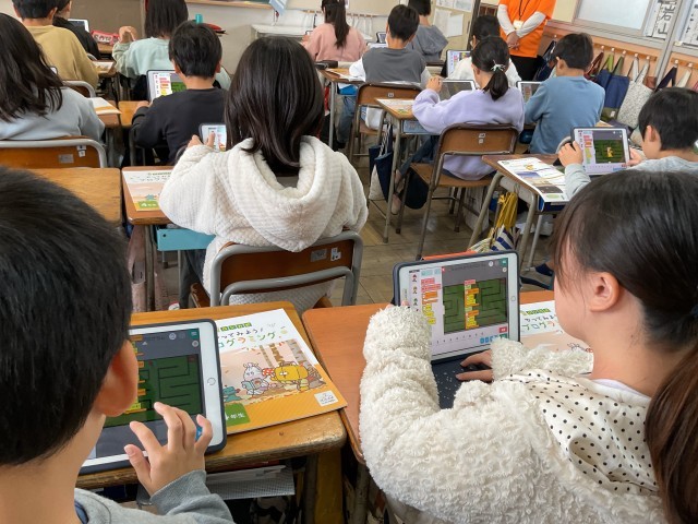 また、3年生のプログラミング教室がありました。講師の方に来ていただいて、2時間楽しく学びます。今日は「あるけ!あおむしくん!」です。黄色のあおむしくんに「30すすむ」と「1びょうまつ」ブロックを繰り返しつなげていくと、葉っぱの上を、進んでは止まり・・・の動きがプログラミングされます。最初に動画を見ながら説明を聞くと、自分のタブレットでやってみます。子どもたちは覚えが速いです。少しずつ複雑なプログラミングを覚えていきますが、やる気満々。次はどんなプログラミングでしょう。