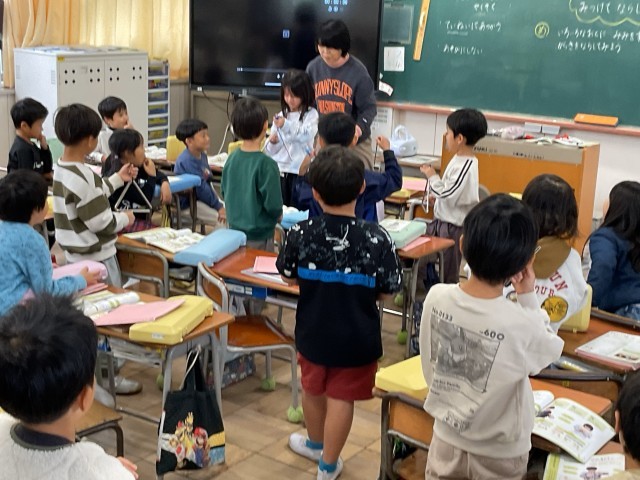 4年生の音楽では、ゲストチィーチャーをお招きして、ご指導いただきました。昨日に続いて2日目です。リコーダー曲「サークル・オブ・ライフ」と合唱曲「エール!!」です。音楽は人との対話だとおっしゃっていました。リコーダ―の音を遠くまで響かせるふき方や、歌声を響かせる声の出し方を、教えていただきました。