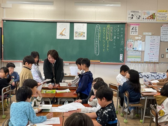 1年生の国語で「じどうしゃくらべ」の学習をしていました。大きな声で音読をしたり、本文から問いの文や説明の文をみつけて、大切な言葉について班で共有したりしていました。この単元の最後には、自分のおしの車をカードに描いて、紹介し合うのを楽しみにしています。