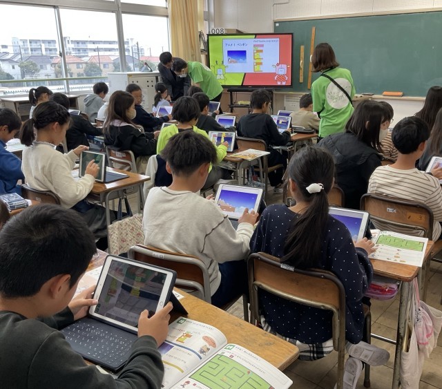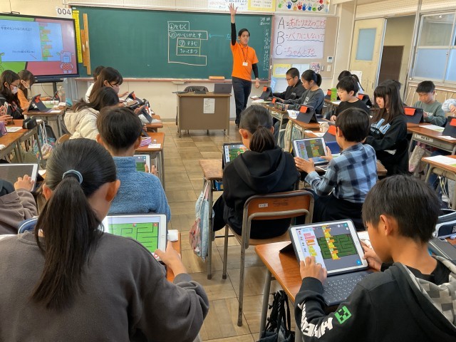 今日のプログラミング学習は、5年生で、すすめ!めいろたんけん!でした。めいろの中を帽子をかぶった男の子4人が右⇒上⇒下など、行っては止まり、向きを変える動きをプログラミングしていました。だんだん複雑な動きになってきますが、やっぱり子どもたちはのみ込みが早いですね。自分のタブレット上で、どんどんブロックをつなげてみたり、数字を大きくしてみたり、試行錯誤していました。
