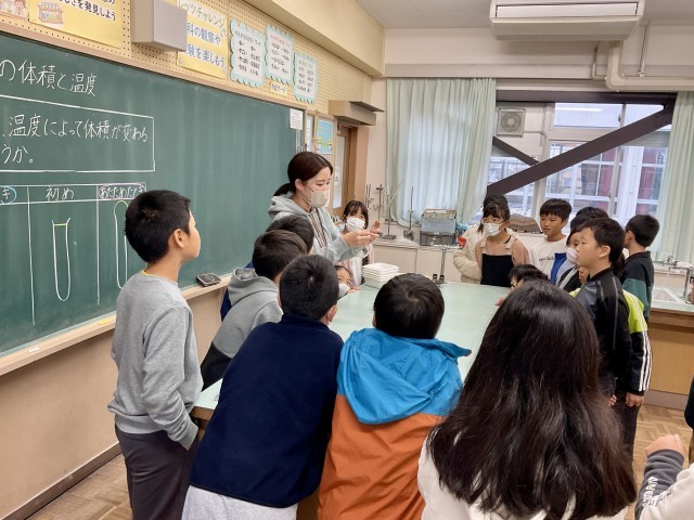 4年生の理科では、気体の体積と温度の実験をしていました。細い試験管につながった丸底フラスコに入った空気を、お湯につけ温めると、細い試験管の中に入れたゼリーが、どんどん上へあがっていきました。そのあと氷水につけると、ゼリーは急降下しました。再びあたためると・・・・。目の前で変化が見える実験は、感動を呼びます。