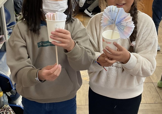2年生が、「紙コップ花火」を作っていました。名前を聞いただけでも遊びたくなるおもちゃに、子どもたちははやく作りたいとやる気満々。教科書の説明文を読みながら、まず、つぎに、それから、さいごに、と、順番に作っていきました。