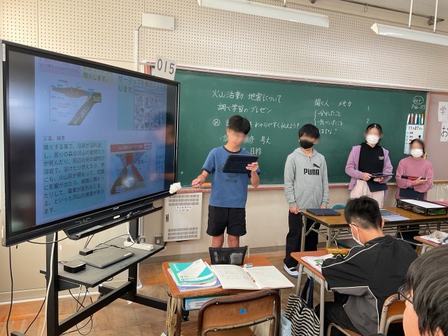 6年生の理科では、火山活動や地震について、調べたことを、タブレットと電子黒板を使ってプレゼンテーションをしていました。2024年度に日本で起こった地震の件数は、3000件もあったそうです。日本は、地下にいくつかのプレートが合流しているため、地震が多い国であり、この調べ学習で地震が身近に迫っていることを感じた子たちも多かったようです。プレゼンテーションする際は、わかりやすく、画面を指したり、見てほしいところを大きく映すなど、プレゼンテーション力も大切です。聞いている人も、しっかりメモをします。メモ力もずいぶんついてきました。