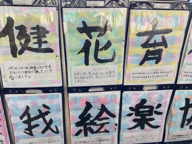 4年生の廊下の掲示は、好きな漢字を習字で書いていました。
