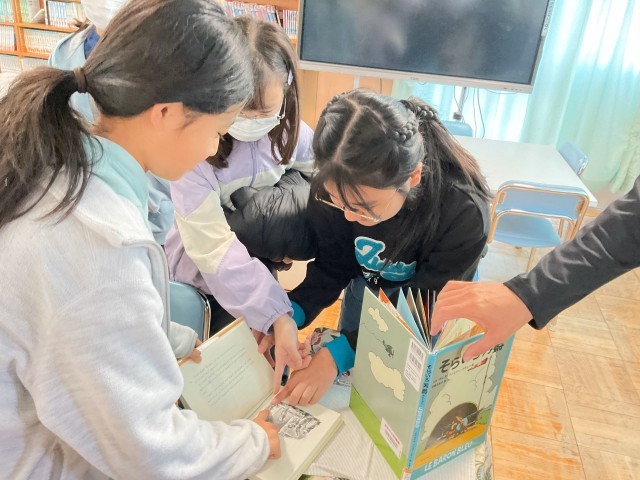 おはなし飛行船は6年生と2年生です。6年生のおはなしは、「金の足のベルタ」「おいしいおかゆ」、絵本は「そらいろ男爵」でした。この絵本は、5年生でも読んでいただきました。主人公のそらいろ男爵は、たくさんのお気に入りの本を敵の兵に読ませることで、戦争を平和的に解決するお話でした。読み終わったあとも、6年生は絵本の周りに集まってきました。2年生のおはなしは、「まめたろう」「王様の耳はロバの耳」絵本は、「おちゃのじかんにきたとら」「わたし」などでした。