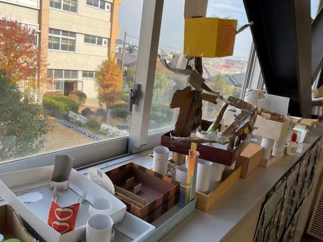 1年生は、図工で、中庭の落ち葉を集めて、画用紙に貼り、作品作りをしていました。へび、かに、ぱんだ ねこ、リース・・・重ねたり、目を書き込んだり、秋を楽しんでいました。