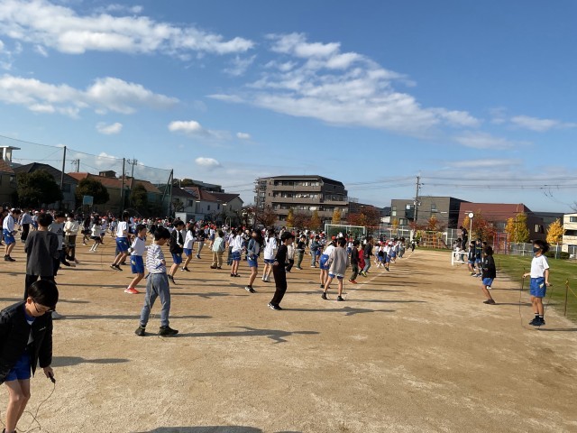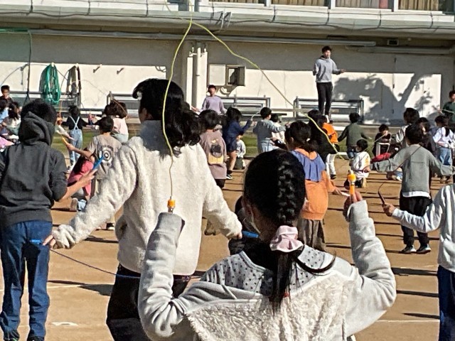 20分休みに、運動場に全校でなわとびをします。体育委員会の5.6年生が前で見本で跳びながら、前跳び、後ろ跳び、そしてリズムなわ跳びでは、片足跳びも入って、曲に合わせてリズムよく跳びます。縄跳びは省スペースで運動量も高く、リズム感や姿勢をよくしたりする効果もあります。冬は体を温めるのに、もってこいです。でも、大人は、膝を傷めないように気をつけましょう。2年生は、運動会のダンスに向けて、日頃から縄跳びを練習していたので、得意げに跳んでいました。