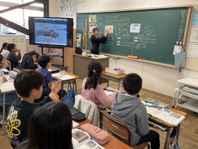 4年生の道徳では、「ウミガメの命」の話から、4年生が総合学習で大切にしている「みどりっこトープ」の中で生きている生き物の生命を大切にする気持ちを考えていました。