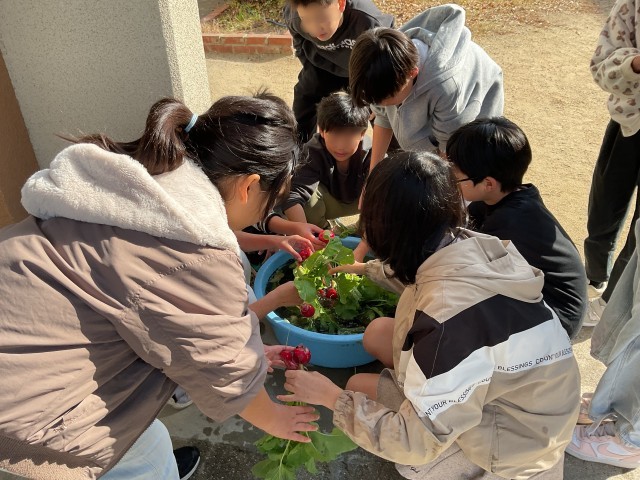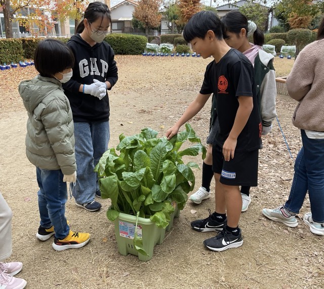 5年生の総合学習では、JAの方に出前授業できていただき、ラディッシュと小松菜を収穫しました。プランターの上に被せた虫よけ用カバーを外すと、のカバーからはみ出るくらい、ラディッシュの葉がところせましと生い茂っていました。子どもたちは、葉を持ってひっぱると、赤いラディッシュが顔をだしました。洗って土をとり、新鮮なうちに食べたいですね。