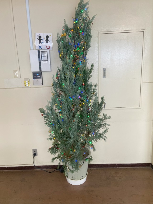 イルミネーションの準備も整い、試験的に点灯されていました。中央玄関を入ったところに、ハーブクラブの方からいただいたクリスマスツリーが飾られました。電飾をつけて、すっかりクリスマスモードになりました。