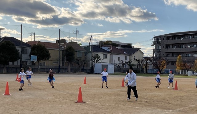 6時目は、4年生の体育でクラスリレーの学習をしていました。めあてはリードの仕方を話し合い、チームの記録を更新しよう。です。カーブを早く走るための、ぐるぐるコースを走ったり、チーム6人でリードしながらのバトンパスを確かめながら練習したあとは、作戦を立てて、いよいよリレーです。チームごとにタイムを計りました。今日、記録更新できたのは、1グループ。欠席者もあったこともあり、まだまだ伸びしろはあります。ワークシートに振り返りを書き、次の時間を楽しみにして今日の授業は終わりました。
