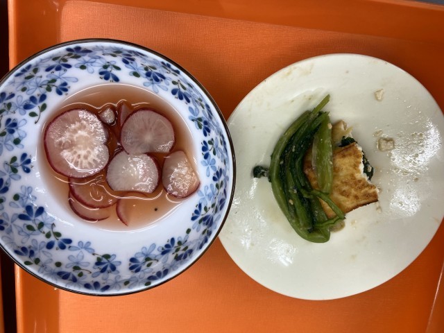 5年生の家庭科では、昨日収穫した野菜たちを調理していました。ラディッシュのマリネ風サラダは、シャキッとさっぱりとしていました。小松菜と厚揚げのはさみ揚げは、少し甘口で、小松菜と厚揚げの相性はばっちりでした。写真は半分食べたあとです。自分で育てて食べる・・・野菜嫌いがなくなりますね。