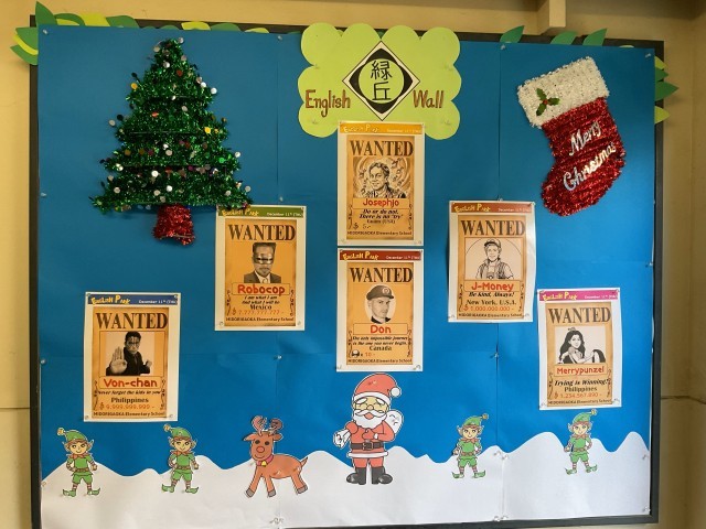 英語の掲示板が、クリスマスバーションに代わったと思ったら、指名手配中の人物が・・・来週は、5.6年生の英語の授業で、English Park が開催されます。楽しみですね。