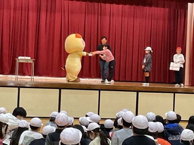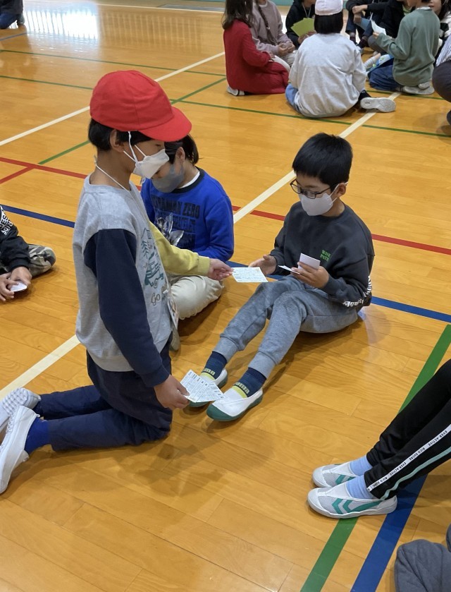 午後からは、しぶたに学園の4年生の小小交流が秦野小学校の体育館でありました。五月丘小学校・緑丘小学校・秦野小学校の紹介から始まり、誕生日順に並んだあとは、グループで名刺交換をしました。自分が通う学校と違う学校のお友だちと交換するのがルールです。そこで、少しうちとけてから、都道府県の名前ビンゴでは、ビンゴシートにグループで協力して県名を書き、読み上げられた県名があれば、○をつけ、ビンゴをねらいます。大阪府が読み上げられた時には、大歓声があがりました。その後、学園マスコットしぶたんも登場!ハッピー10のお祝いをもらって、それぞれの学校へと帰っていきました。交換した名刺カードは、また会えるときまでの宝物です。
