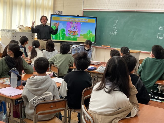 4年生の社会では、池田市の南どなりに位置する、豊中市について学習をしていました。電子黒板に写された2つのグラフは、豊中市の人口の移り変わりと、豊中市に住んでいる外国人の数のうつりかわりです。なぜ、豊中市の人口は、かわらないのに、外国人の数は増えたのでしょう。難しい問題に、まずはひとりひとりでノートに予想を立てて理由を書いて発表していました。