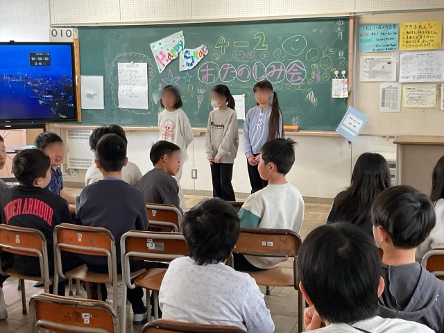 4年生の学級会の議題の提案は、「二学期がんばったことを祝して、思い出に残るお楽しみ会をして、二学期を締めくくろう」として、話し合っていました。明日のお楽しみ会、仲良くできるといいですね。
