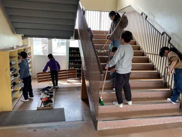 終業式まで、きょうを含めて、あと3日となりました。それぞれの教室では、課題が終わったクラスでは、お楽しみ会や、転校する子のお別れ会などが行われていました。3限目から地区別集会・集団下校が始まりました。5年生が最高学年となって新しい地区別の班編成をします。4月の始まりの2週間は、新1年生も加わり集団登校をします。