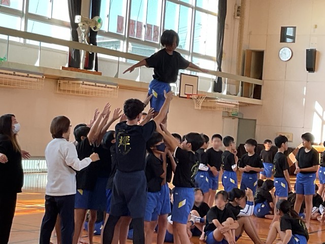 5.6年生も、本番の衣装の背中に「輝」の文字が入った黒いTシャツを着て、組体操の練習です。今日はトラストフォールを集中的に練習しました。