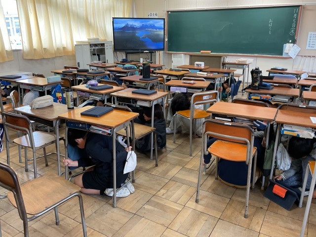 10:00から、880万人地震避難訓練を行いました。実施前に、事前学習として、教室で地震が起こった時に、窓や入口の戸を開けて、逃げ道を作る事や、動画「津波からにげる」アニメを見て、地震が起きて津波に襲われたときにどう避難するのかを学んでいました。「地震が発生しました」の放送で、机の下に潜ります。10:05には、地震が収まり、机から出てきて訓練終了となりました。