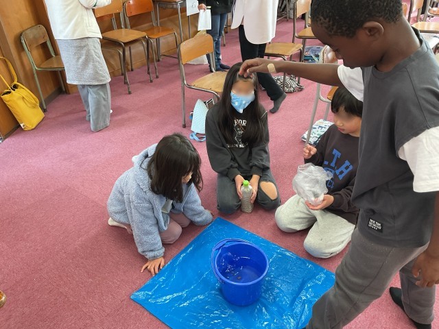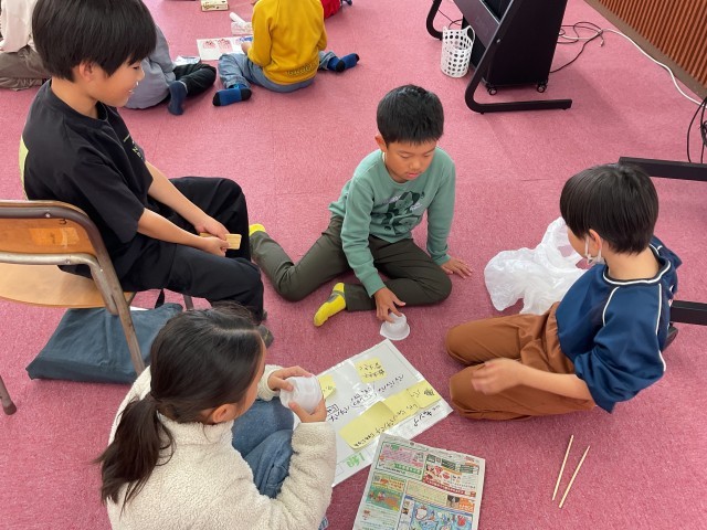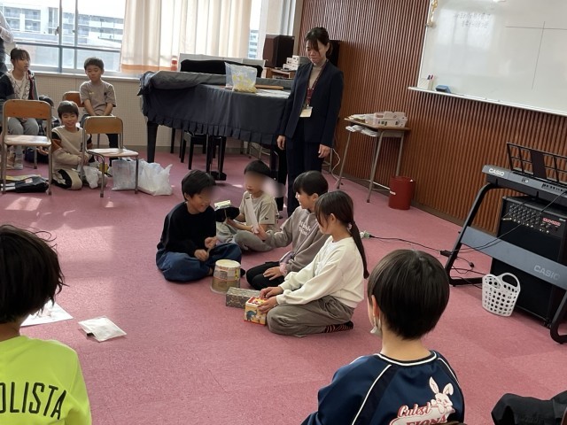 3年生の音楽では、音づくりをしていました。音の重なりを意識して、イメージが伝わるように音楽をつくりかえようです。これまでに、身近な材料を使って、4,5人のグループで音づくりをしてきました。石・木・箱・金属・ビニールなどをこすったり、叩いたりしながら、つくられた音色に、イメージを膨らませていました。まつり、動物園、料理、海・・・。子どもたちは、音を聞いただけで、どんなテーマなのかを当てていました。トントントン・・・空のペットボトルで床を叩いて鳴らすと、包丁で野菜を切る音に聞こえてきます。もっと料理の音らしくするためのアドバイスを求めると、「木の上で叩いてみたら」、という声が。まな板の上で野菜を切る包丁の音に近づきました。「うん。包丁の音だ」。音作りは、音楽が苦手な子でも、音を楽しめる学習です。