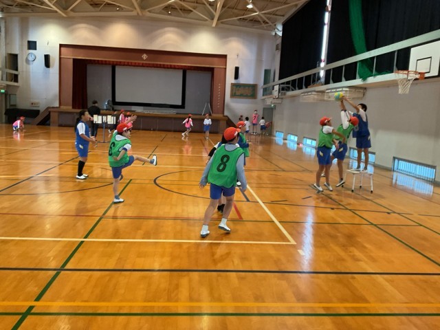 4年生の体育では、ポートボールをしていました。ドリブルはなしでパスだけでボールを回して、台の上にいるゴールマンにボールを渡し、キャッチしたら得点になります。