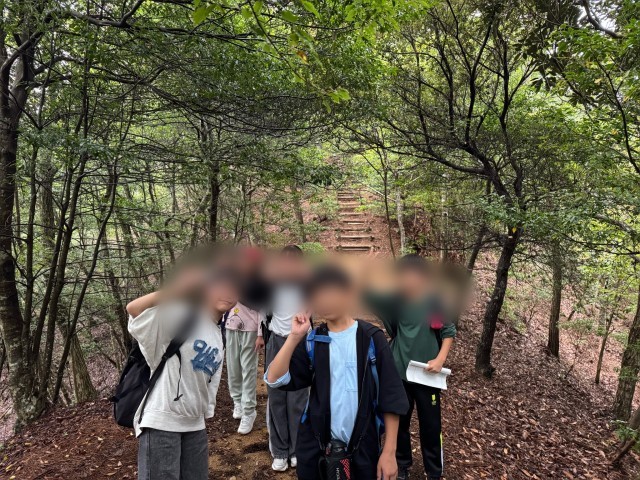 午前中のカレー作りの時は雨。クイズラリーはできなさそうでしたが、カレー作りが終わった途端、雨が止みました。急遽、私とT先生(担任)とT先生(音楽)の3人でコースを確認しに行くことに。クイズラリーのコースは結構山道。3人で励まし合いながらコース確認をすると、山道は歩きやすい状態でした。そして、クイズラリーを実施することにしました。