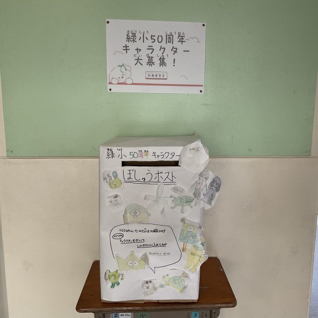 来年度は、緑小創立50周年になります。計画委員から、50周年に向けて、キャラクター募集を呼び掛けていました。中央玄関に応募用ボックスが置かれました。オリジナルの緑小をイメージしたキャラクター大募集です。