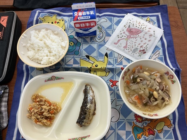 今日の給食は節分献立。鬼除け汁・いわしの生姜煮・セルフ手巻きの具・てまきのり・ごはん・牛乳でした。手巻きのりパッケージイラストに応募した作品の中から、8作品が選ばれ、印刷されたイラストが池田市内の小中学校に配られています。緑小の児童も選ばれています。