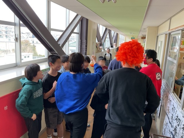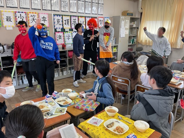 さて、そんな給食の時間に、子どもたちにはサプライズで、赤や青の鬼たち4人組が緑小の教室にやってきました。驚いた子どもたちの前で、鬼たちによって担任の先生が連れ去られようとします。「いってらっしゃい」と反応するクラスもあれば、「連れて行かないで」と先生を守ろうとするクラスもありました。