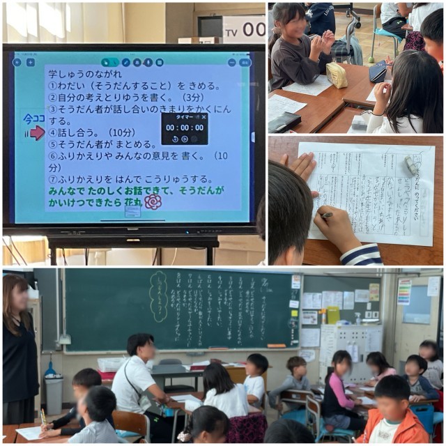2年生の国語の授業をのぞいてみました。グループの中で相談したい人を一人決めて、相談された人が自分の考えと理由を書き、話し合いの決まりをもとに、みんなで意見を聞くといった活動をしていました。みんなで楽しくお話ができ、相談した内容が解決できていたようです。話し合うということは、大事ですね。