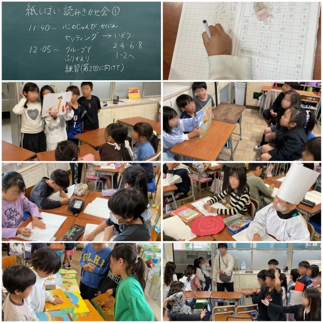 図書館司書の先生に、1年生にとって適した内容や量の紙芝居を相談し、読む練習してきました。読むポイントの一つとして、その話の登場人物になりきるということで、衣装を着て読む児童も見られました。