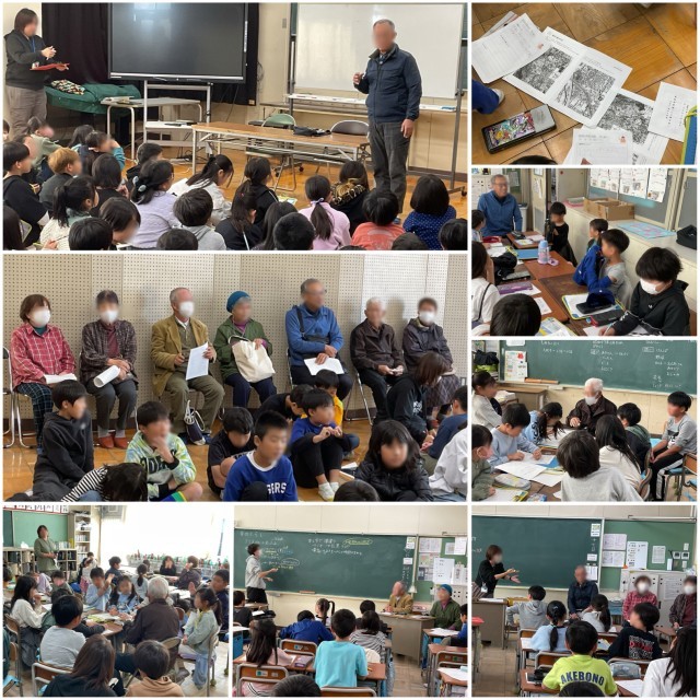 今日は、総合学習「まちのすてきをみちけよう」をテーマに、地域の方々、八坂会のみなさん8名にきていただき、お話を聞きました。まずはじめに、神田地域の歴史について、たんぼが広がっている昔の神田の様子や八坂神社や常福寺のことについて詳しくお話を聞きました。子どもたちは、プリントに聞いたことをいっぱい書き込んでいました。その後、各教室に分かれて、聞いたことをもとに質問をたくさんして、それに対して丁寧に答えていただきました。遊びやおやつ、今と昔とどちらが住みよいかなど、いろいろな質問が出ました。