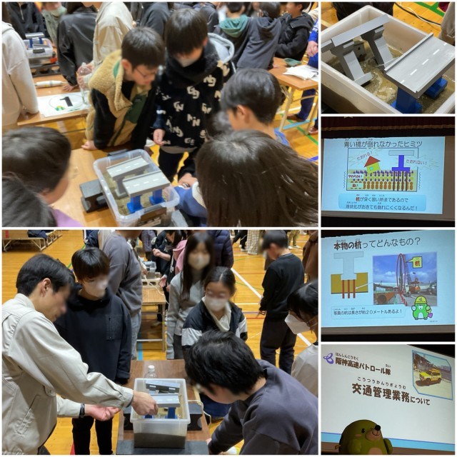 5・6年生は、今日の5・6時間目に、阪神高速の方々による出前授業を受けました。関係者総勢20名が来られ、2時間たっぷり、お話や実験を行いました。