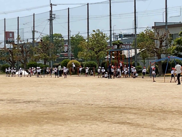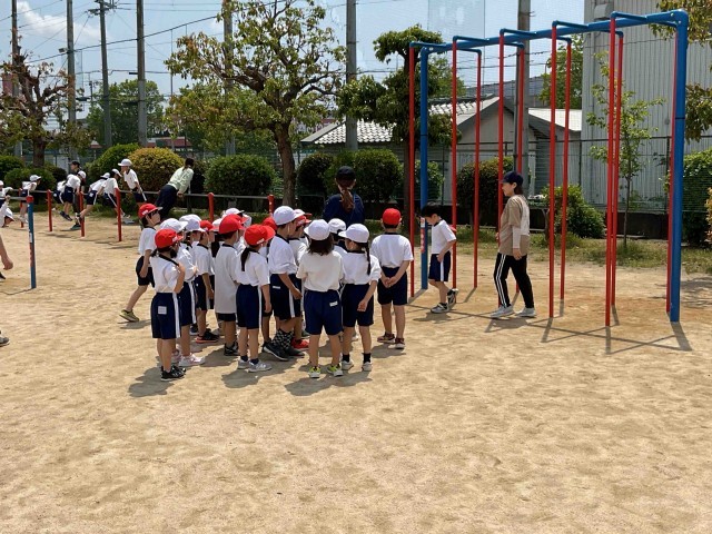 1年生は鉄棒やのぼり棒、うんていなど、神田小学校のグランド内にある遊具の使い方を教えてもらって、その後自由に遊んでいました。
