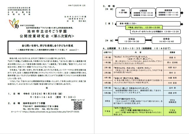 2025年度公開授業研究会のご案内を配布文書に公開しました。授業内容や時程等詳しくは二次案内をご覧いただき、お申込みいただければと思います。