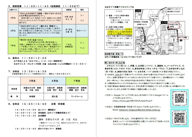 下のURLを参照いただくか、本ページの配布文書中、公開授業研の案内などをご覧いただき、お申し込みください。ご不明な点がございましたら直接お電話ください。