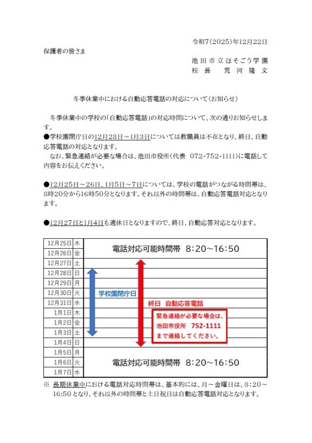 冬季休業中の自動応答電話対応について