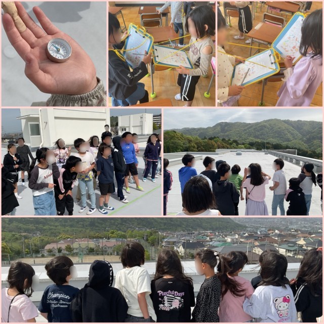 「こっちが北や!」「ということは、あっちは南!」と声をかけ合いながら、それぞれの方向に何が見えるのかを探します。