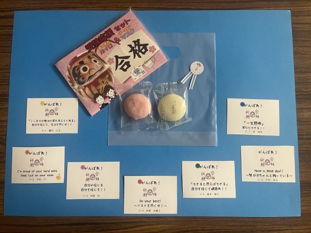 先週金曜日には、PTAから合格祈願の、合格餅と合格マスクが、3年生に配布されました。
